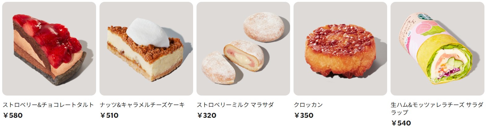 | 4月 | 2025年4月9日(水)発売 ストロベリータルト ¥570 ストロベリードーナツ ¥310 ※再販 クッキー&クリームシフォンケーキ ¥460 ※再販 アールグレイミルククリームドーナツ ¥310 ※再販 シナモンロール ¥420 ブルーベリー カップスコーン ¥400【限定店舗】 チキンアラビアータ 石窯フィローネ ¥550 ※再販 |