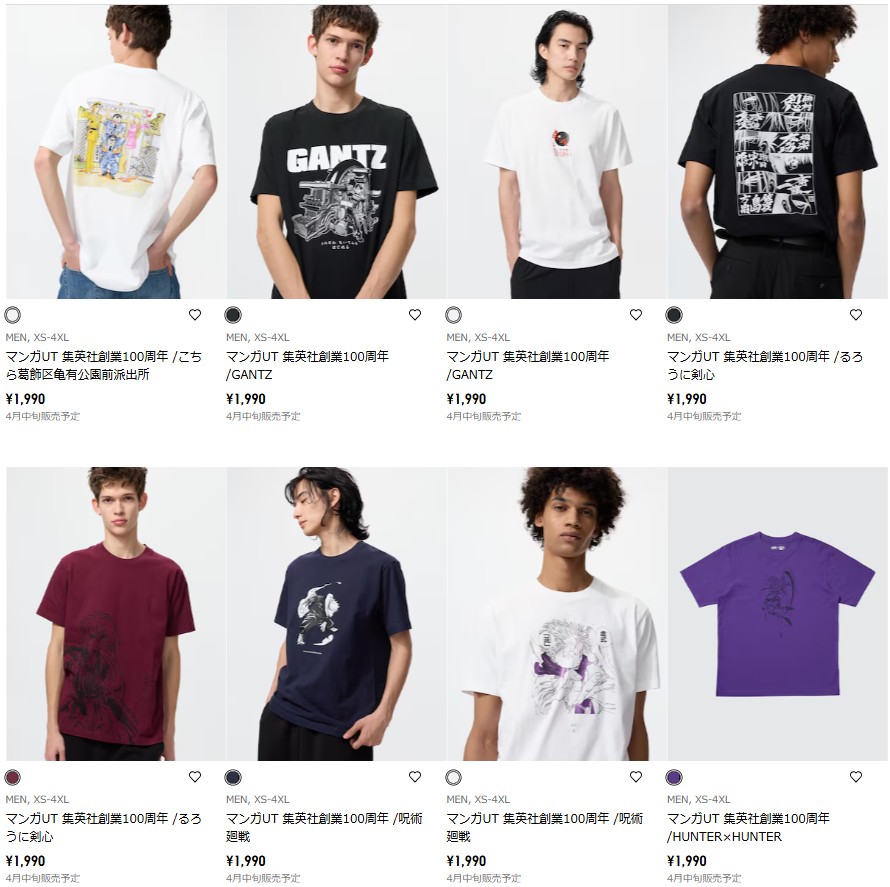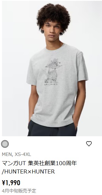 | 4月中旬 | メンズ👨: UT(半袖)1990円【全9種】 こち亀【全1種】 GANTZ(ガンツ)【全2種】 るろうに剣心【全2種】 呪術廻戦【全2種】 HUNTER×HUNTER(ハンターハンター)【全2種】 |
